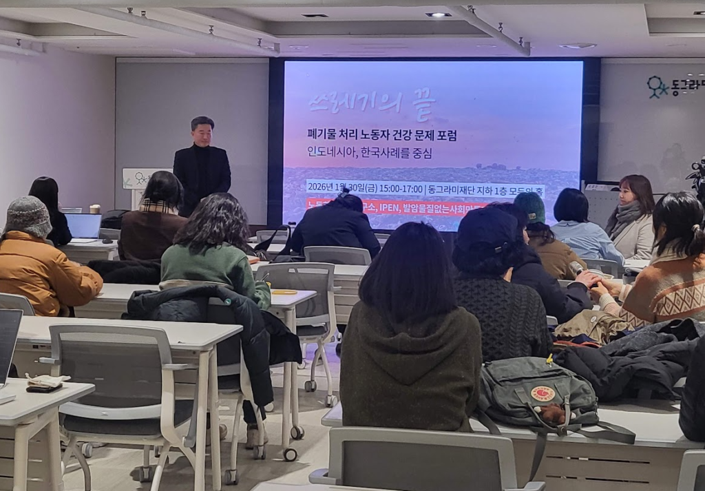 2026년 1월 30일 첫 겨울학교는 인도네시아와 한국 양국에서 들여다본 폐기물 처리 노동자의 건강 문제와 유해물질을 주제로 열렸습니다. 결국 쓰레기의 끝에도 사람이 있었고, 그 아래에는 지구가 놓여있었습니다. 오프라인에 약 30여 분 가득 채웠고, 실시간 온라인 중계에도 약 20여 분께서 함께 해주신 그 날의 내용을 간단히 정리해봅니다. 먼저 2025년 노동환경건강연구소와 인도네시아 현장조사를 다녀온 유혜민 감독님의 스케치 영상을 보시죠.