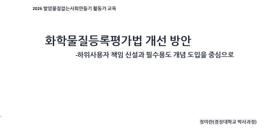 더 안전한 세상을 만들기 위한 화학물질 활동가들의 네트워크와 공부 모임 ‘겨울학교’! 이번 2026년 겨울학교에서는 정미란 연구자를 모시고 <화학물질등록평가법 개선 방안 ; 하위사용자 책임 신설과 필수용도 개념 도입을 중심으로> 주제로 이야기를 나눠보았습니다. 강의가 끝나고도 화학물질 활동가들의 열띤 질의 응답이 이어져, 활동가 역량 강화와 유해물질로부터 안전한 사회의 기틀을 다진 기회가 되었답니다.