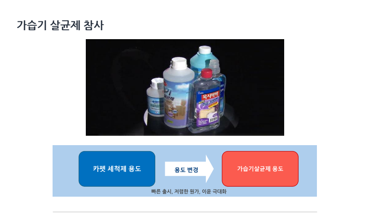 가습기 살균제 참사의 원인 : 카펫 세척제 용도였으나 빠른 출시, 저렴한 원가를 위해 가습기 살균제 원료로 용도가 변경됨