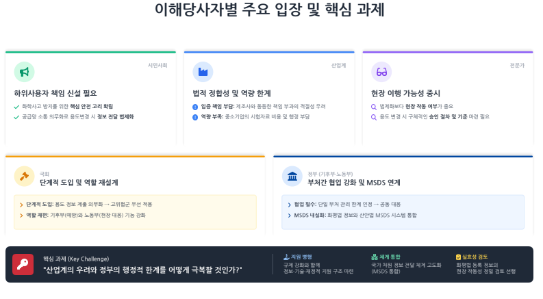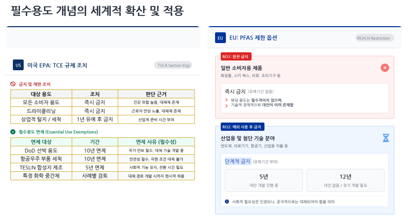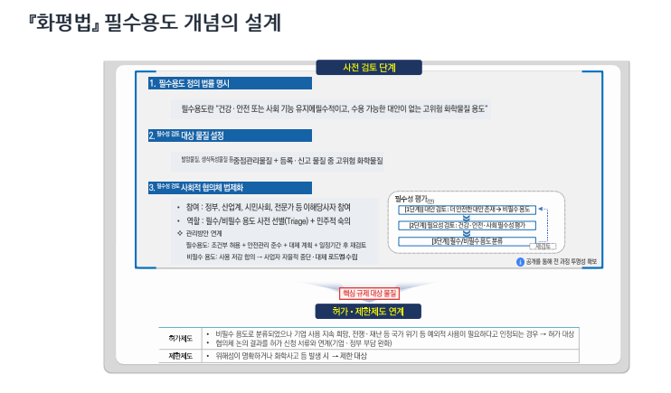 대안이 없는가? / 꼭 사용해야 하는 물건인가?에 해당하면 금지 대신 예외적인 사용인 필수용도를 적용합니다. 하지만 산업계의 우려와 정부의 행정적 한계를 어떻게 극복해야 할까요.