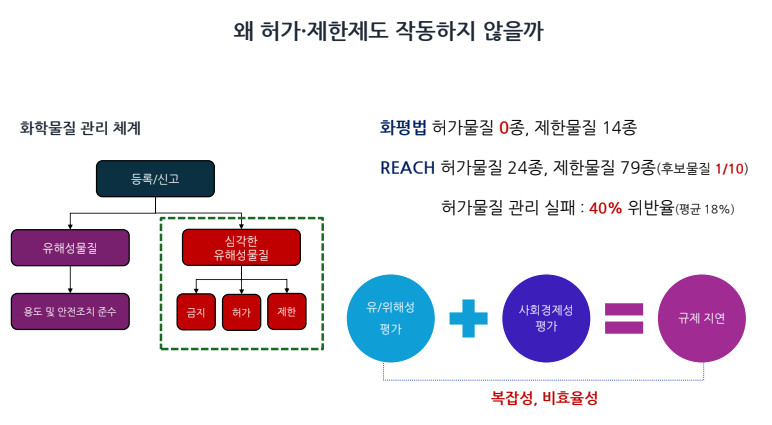 그러나 현실은 다음과 같아요. 심각한 유해성 물질은 금지, 허가, 제한물질로 지정되는데요. 화평법이 시행된 지 10년 간 허가물질 0종, 제한물질 14종만 지정되었습니다. 또한 허가물질 관리는 40% 위반율을 보이고 있습니다.