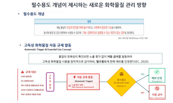 필수용도 개념 등장 : 고독성 화학물질 자동 규제 발동, 원칙적으로 금지하되 필수용도에 한해 예외를 인정한다는 것입니다.
